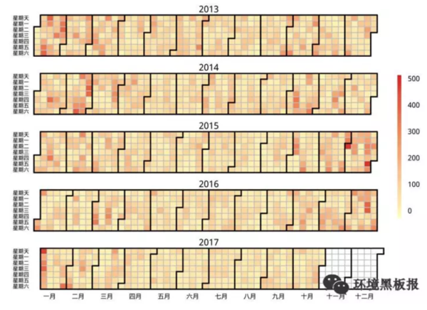 下图是2013年1月-2017年10月北京市PM2.5日平均浓度的热度图(单位:微克/立方米),我们可以看出,这几年,PM2.5高浓度天数确实在减少,低浓度天数在增加。
