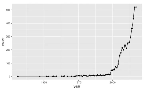 这个现象可能有点反直觉,因为近几年大气环境污染的公众关注度非常高,经费投放也很可观,但学术界却降低了学术交流频次。无独有偶,使用传统研究热点例如汞、铬、二恶英、基因组、纳米颗粒去进行检索,都会发现研究在2014-2015年间出现了峰值。但同时如果去看一些新兴研究例如3D打印,颗粒物中的细颗粒物(fine particulate matter),则增长还是非常迅速的(下图是以细颗粒物为关键词的文献发表状况)。