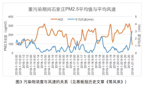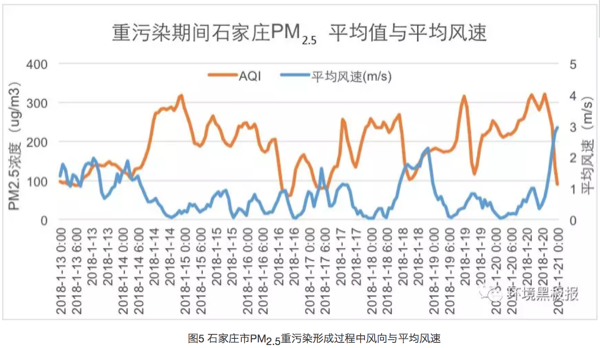 在此过程中,风速与空气污染指数呈现明显的负相关关系(图5)。风与霾此消彼长,在石家庄市展开拉锯战,持续时间已经超过一周。中间几次过程,主要风速大于1米/秒,空气污染就会得到改善。一旦面临静风时刻,污染物开始逐渐累积。