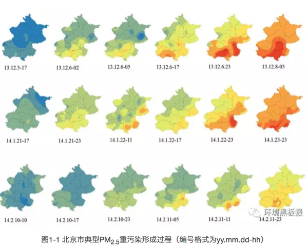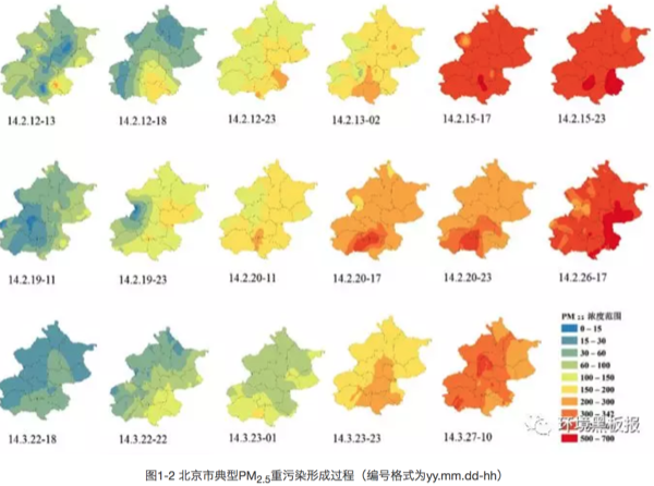 北京PM2.5重污染事件主要受外源传输影响。从重污染形成的过程看,北京这六次重污染过程中,细颗粒物从北京东南部或者南部,逐渐向城中心和西北部缓慢扩散,最终全城形成重污染(图1)。