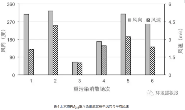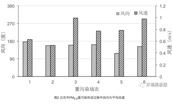 在重污染形成期间北京平均风速低于1米/秒,主导风向为南风和东南风(图2),说明北京的PM2.5重污染的形成受外源传输影响较大。主要的污染物来自北京东南部和南部的廊坊、天津和保定等省市。重污染的形成时间一般为3-7天。