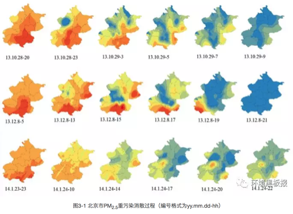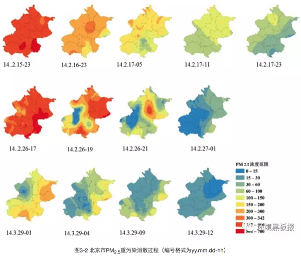 首先我们将北京全市PM2.5(细颗粒物)日平均浓度高于200微克/立方米、持续时间超过2小时的污染状况定义为一次重污染事件,2013年8月到2014年8月期间,我们共观察到六次重污染事件,分别为2013年10月28日(265.59微克/立方米)、2013年12月8日(202.63微克/立方米)、2014年1月23日(233.71微克/立方米)、2014年2月15日(437.15微克/立方米)、2014年2月26日(337.39微克/立方米)和2014年3月27日(234.32微克/立方米)。我们基于GIS软件,通过克里金差值方法对这六次重污染过程形成和消散过程进行了模拟。